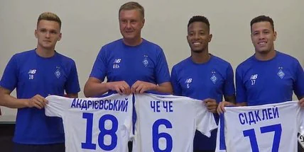 Главный тренер "Динамо" Александр Хацкевич вручил игровые футболки Александру Андриевскому, Че Че и Сидклею.