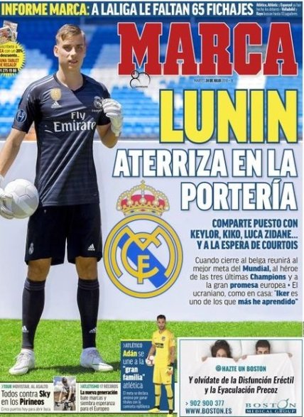Украинский вратарь Андрей Лунин, который подписал шестилетний контракт с мадридским "Реалом", попал на обложку крупного испанского спортивного издания Marca.