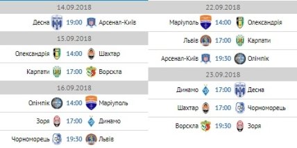 9-й тур начнется 22 сентября матчем Мариуполь - Александрия, а завершится 23 сентября встречей Ворсклы и Зари. Стоит отметить, что полтавчанам придется сыграть через два дня на третий против Зари после выезда в Лондон на стадион Эмирейтс. Динамо и Шахтер проэкзаменируют новичка УПЛ и команду, чудом оставшуюся в Премьер-лиге - Десну и Черноморец соответственно. Матчи лидеров начнутся в 17:00, а Зари и Ворсклы в 19:30.