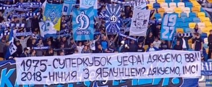 Болельщики Динамо пришли на матч с Олимпиком с очередным ярким баннером. В этот раз они «поблагодарили» президента клуба Игоря Суркиса за результат в последнем поединке с Яблонцем (2:2) во втором туре Лиги Европы.