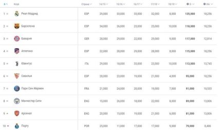 Первое место рейтинга по-прежнему возглавляет мадридский Реал, следом идут Барселона, Бавария и Атлетико Мадрид. Замыкает первую десятку португальский Порту.