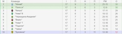 Таким образом перед 18-м туром в группе А лидирует Минай и Полесье с 30 очками в активе, Чайка и Буковина замыкают таблицу с 14 и 12 очками соответственно.
