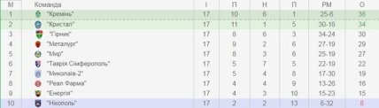 В группе Б лидирует Кремень с 36 очками, сразу за ним с 34 баллами следует Кристалл, а замыкает таблицу Энергия и Никополь с 15 и 8 очками соответственно.