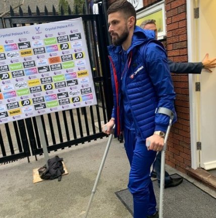 «Повреждение лодыжки. Жиру на костылях», — написал в своём «твиттере» журналист HLN Кристоф Террье, прикрепив фотографию форварда.