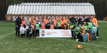 Футболисты донецкой команды провели несколько игровых упражнений со своими гостями, после чего сделали совместные фото на память.