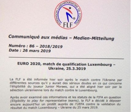 «После игры с Украиной Федерация футбола Люксембурга из разных источников получила сообщение, что есть серьезные сомнения относительно участия в матче игрока Жуниора Мораеса, который вчера был в стартовом составе сборной Украины в игре против Люксембурга.