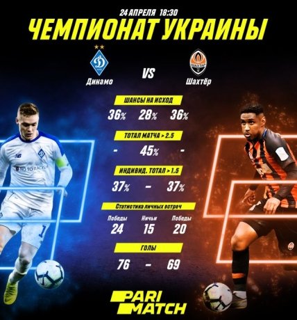 Команды встречались в рамках чемпионата Украины 59 раз и только 15 игр завершились мировой. Добавим, что у «Динамо» пока что больше побед (24 против 20), а также забитых мячей (76 против 69). А вот что касается ближайшей игры то шансы на успех по оценкам аналитиков Parimatch равные. И у «Динамо», и у «Шахтера» по 36% на победу и 28% на ничью.