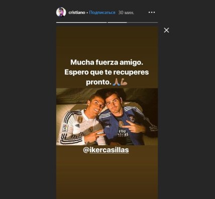 Форвард "Ювентуса" Криштиану Роналду поддержал бывшего партнёра по "Реалу" Икера Касильяса, который в среду, 1 мая, перенёс сердечный приступ.