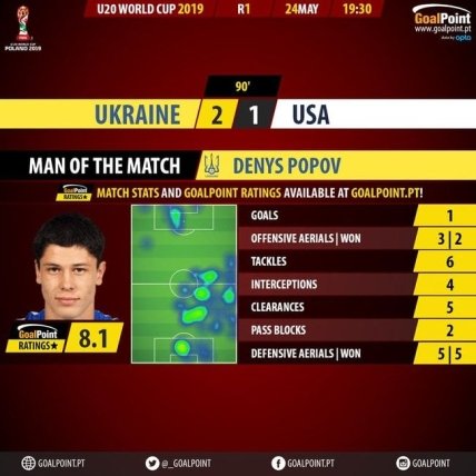 Денис Попов стал лучшим игроком матча Украина - США первого тура группового этапа чемпионата мира-2019 U-20 в Польше. Об этом сообщил аналитический портал GoalPoint.