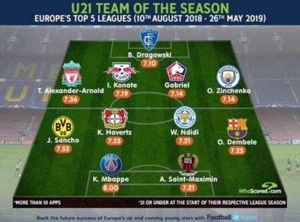 Портал WhoScored составил сборную из молодых игроков (до 21 года), которые лучше всех провели сезон в ТОП-5 национальных чемпионатов Европы.