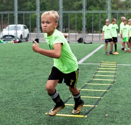 Футбол детско-юношеский, а подход к тренировкам - профессиональный. Начали тренировку с разминки и беговых упражнений, чтобы улучшать свою физическую подготовку. "Тест Купера" ребятам бежать еще рано, а вот на традиционной "лесенке" футболисты выкладываются по полной: