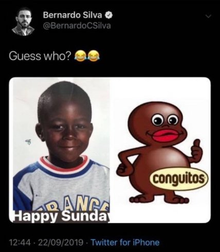 Полузашитник Манчестер Сити Бернарду Силва может получить дисквалификацию за свое сообщение в Twitter, где он пошутил в адрес своего одноклубника Бенжамена Менди. Бернарду выложил фотографию француза в детстве, а рядом с ней - изображение с упаковки испанских конфет Conguitos. Хавбек сопроводил твит подписью: "Угадайте, кто?".