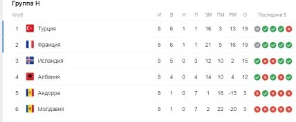 Таким образом, Турция продолжает возглавлять группу H, Франция - вторая. Для выхода в следующий раунд Турции необходимо не проиграть Исландии, Франции достаточно обыграть Молдову.