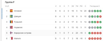 В группе F Швеция и Испания поделили очки, Румыния и Норвегия также сыграли вничью, а Фарерские острова победили Мальту.