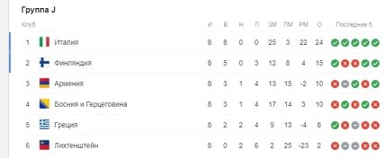 В группе J Италия разгромила Лихтенштейн, Финляндия "уничтожила" Армению, греки минимально переиграли боснийцев.