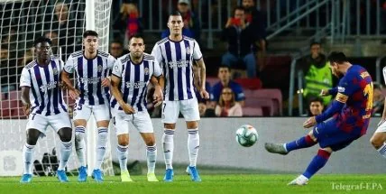 Аргентинский футболист Лионель Месси "положил" очередной гол со штрафного в матче Барселона - Реал Вальядолид. Каталонская команда обыграла гостей со счетом 5:1.