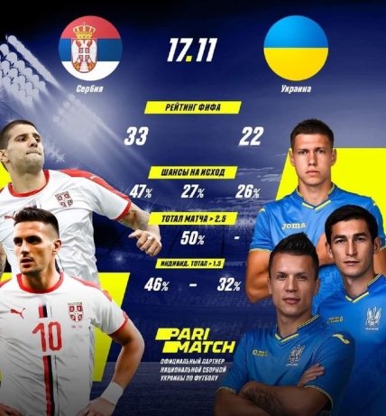 Что же касается шансов на успех, то пока что тут расклады на стороне хозяев поля. Хотя преимущество не сильно большое. Аналитики Parimatch дают 47% на победу Сербии и 26% на успех сборной Украины (27% на ничью).