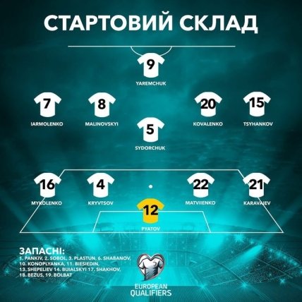 Стартовый состав сборной Украины: 12. Андрей Пятов (к), 16. Виталий Миколенко, 4. Сергей Кривцов, 22 Николай Матвиенко, 21 Александр Караваев, 5. Сергей Сидорчук, 8. Руслан Малиновский, 20. Виктор Коваленко, 15. Виктор Цыганков, 7. Андрей Ярмоленко, 9. Роман Яремчук.