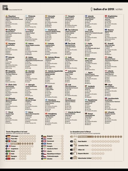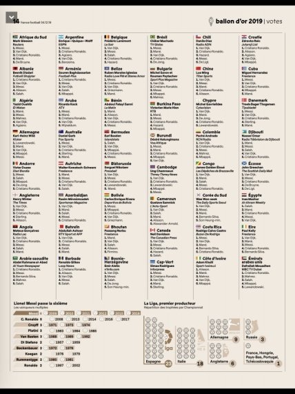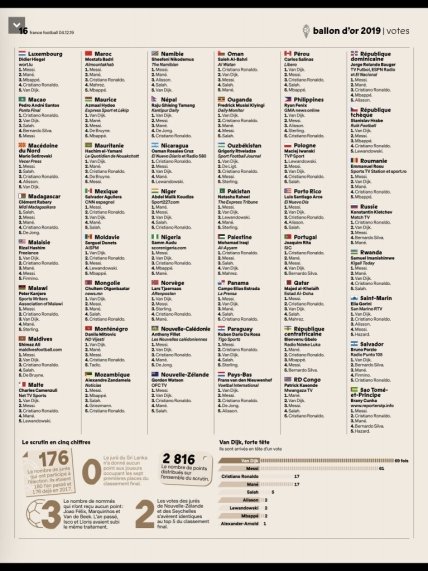 В остальных частях света первенствовал аргентинец. В Южной Америке (47:39), Северной Америке (102:86), в Океании (22:14) и Африке (187:154) он стал лидером опроса. Примечательно, что на африканском континенте второе место досталось сенегальцу Садио Мане (170 баллов), который набрал в итоге четвертую сумму, уступив и Криштиану Роналду из «Ювентуса».