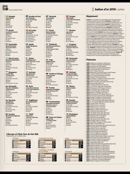 В Европе не оказалось равных защитнику «Ливерпуля» Вирджилу ван Дейку, который в итоге стал вторым. Он получил в Старом свете 231 пункт, Месси – 194. В Азии также не было равных нидерландцу – 155 против 134.