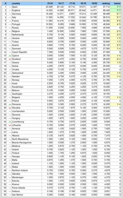 У Австрии, Бельгии и Нидерландов осталось по два клуба в Лиге Европы, а у Украины и Турции – по одному (отметим, что у России вылетели уже все 6 клубов). Поскольку теперь ясно, что в таблице 2020 Нидерланды никак не достать, главной задачей на текущий сезон становится – не пропустить вперед турков.