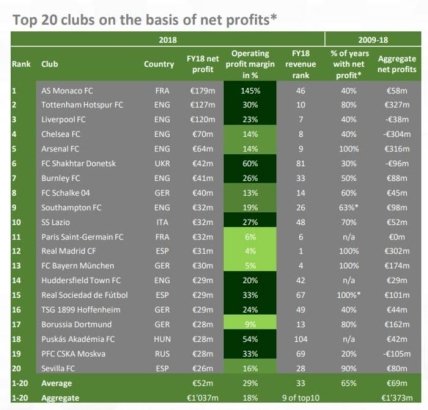 Возглавил рейтинг французский Монако - "монегаски" заработали за позапрошлый год 179 млн евро. На второй строчке расположился английский Тоттенхэм с 127 млн евро чистой прибыли. Также в тройку лидеров вошел прошлогодний победитель Лиги чемпионов Ливерпуль - 120 млн.