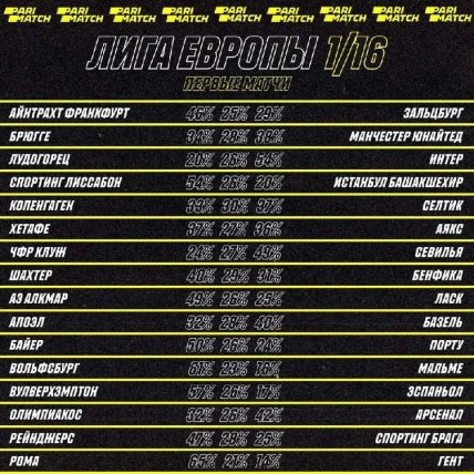 Что касается других пар, то выделить кого-то очень сложно. Практически везде ожидается серьезная борьба. Даже у «Аякса», полуфиналиста прошлого сезона Лиги чемпионов, только 36% от Parimatch на победу против 37% у «Хетафе», который почти 10 лет не играл в еврокубках.