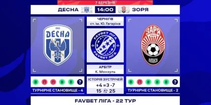 На матче в Чернигове будет работать полностью женская бригада арбитров во главе с харьковчанкой Катериной Монзуль. В её активе в Премьер-лиге ровно 30 матчей. Три из них были с участием «Десны», и Монзуль фиксировала в них одну победу черниговцев и два их поражения, мячи 2:6. Наша команда с Монзуль провела 5 игр: 3 победы, и по одной ничьей и поражению, мячи 10:7.