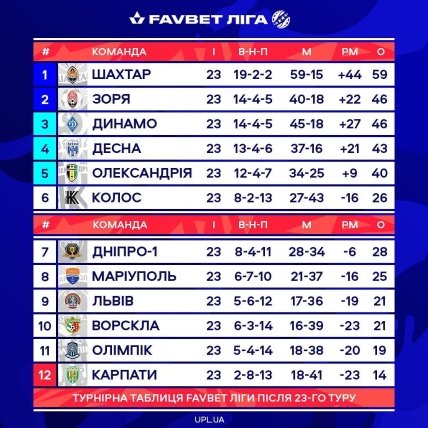 Турнирное положение команд после 23-х туров/ Фото: УПЛ