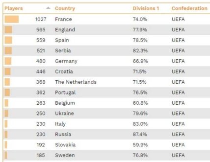 Как сообщается, больше всего футболистов за рубежом выступает из Бразилии (1600 человек), а на втором месте расположилась Франция (1027). Замкнула тройку Аргентина (972).