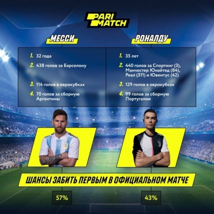 Тем не менее, аналитики Parimatch представили свой прогноз на то, кто же первым сможет забить мяч в официальной игре после карантина, Криштиану или Лионель. По мнению экспертов, больше шансов у аргентинца, 57% против 43%.
