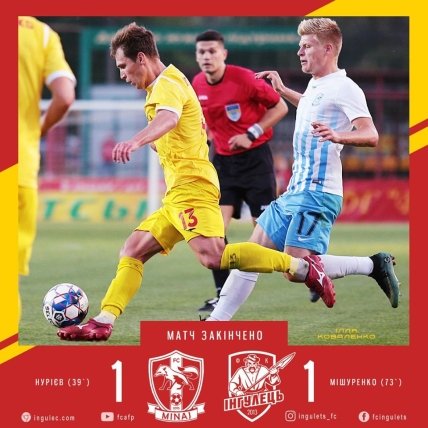 «Минай» вышел вперед в конце первого тайма - забил Нуриев. На 73-й минуте Мишуренко счет сравнял. В итоге ничья 1:1, которую в свое пользу могут записать гости.