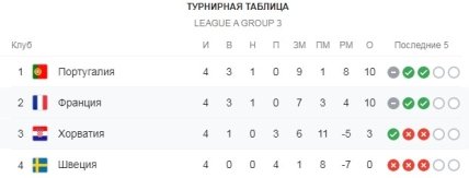 В другом матче группы 3 Лиги А Хорватия минимально уступила Франции. Таким образом, Португалия вместе с Францией лидируют в квартете: