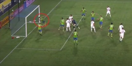 На 15-й минуте поединка при счете 0:0 Гэлакси получили право на угловой. После подачи со стандарта вратарь гостей неудачно отбил мяч, что привело к удару по воротам без голкипера. Однако на пути "снаряда" оказался полевой игрок Алекс Рольдан, который в прыжке головой достал мяч и переправил круглого в перекладину, после чего его партнер по команде вынес его подальше.
