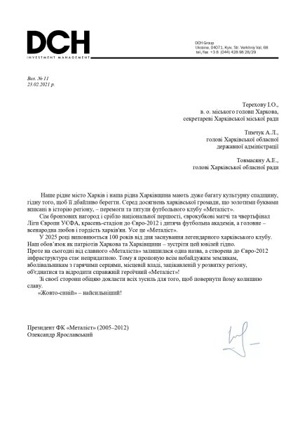 "Наш родной город Харьков и наша родная Харьковщина имеют богатейшее культурное наследие, достойное того, чтобы его бережно хранили. В числе достижений харьковской громады золотыми буквами вписанных в историю региона, победы и титулы футбольного клуба Металлист. Семь бронзовых наград и "серебро" национального первенства, еврокубковые матчи и четвертьфинал Лиги Европы УЕФА, красавец-стадион к Евро-2012, и детская футбольная академия, а главное, всенародная любовь и гордость харьковчан — все это Металлист. В 2025 году исполнится 100 лет со дня основания легендарного харьковского клуба. Наш долг как патриотов Харькова и Харьковщины встретить этот юбилей достойно. Но пока от того славного Металлиста осталось одно название, а созданная к Евро-2012 инфраструктура приходит в негодность.Поэтому я предлагаю всем неравнодушным землякам, болельщикам с горячими сердцами, местной власти, заинтересованной в развитии региона, объединиться и возродить истинный героический Металлист! Со своей стороны обещаю приложить все усилия для того, чтобы вернуть былую славу. Желто-синий" - самый сильный!", - гласит сообщение на официальной страничке Александра Ярославского в facebook.