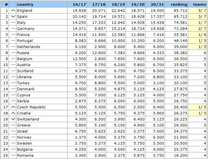 Таблица коэффициентов УЕФА по итогам матчей 18 марта (топ-25)