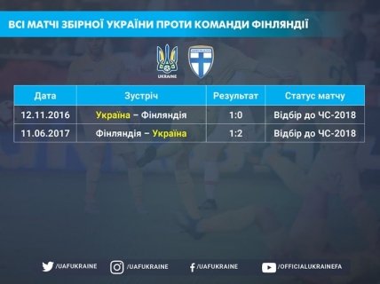 Украина - Финляндия: онлайн матчаВсего Украина и Финляндия провели две игры. Оба матча были сыграны в прошлом отборочном цикле ЧМ. Дома украинцы добыли победу со счетом 1:0, а в гостях "Желто-синие" вновь обыграли финном со счетом 1:2. К слову, букмекеры считают, что подопечные Андрея Шевченко имеют шикарные шансы победить и в третий раз.