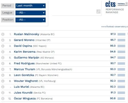 Рейтинг лучших игроков месяца по версии CIES Football Observatory: