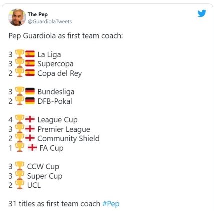 Главный тренер "Манчестер Сити" Хосеп Гвардиола выиграл 31 титул в карьере.