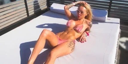 На снимке Ирина позирует у барной стойки возле пляжа в откровенном купальнике и кружевном халате, демонстрируя все свои татуировки и стройную фигуру.