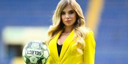 Невеста футболиста "Шахтера" ошеломила глубоким декольте (фото)На фото спортивная журналистка одета в желтый пиджак и черное мини-платье, а в руках красотка держит футбольный мяч.