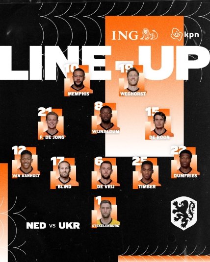 Сборная Нидерландов: Стекеленбург, ван Анхольт, Блинд, де Врей, Тимбер, Думфрис ,Ф. де Йонг, де Рон, Вейналдум, Депай, Вегорст.