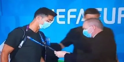 Пятов преподал урок Трубину перед матчем Евро-2020 (видео)Один из охранников не узнал в маске Криштиану и затребовал у того документы. Роналду показал аккредитацию и спокойно прошел контроль.
