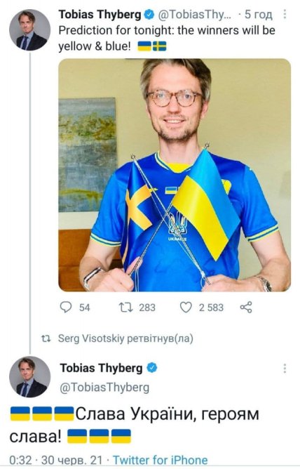 Посол Швеции в Украине Тобиас Тиберг накануне матча отметил, что при любом исходе в матче победят желто-голубые. Не ошибся и поздравил с победой нашу страну.