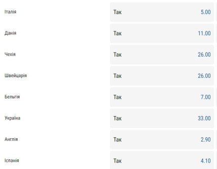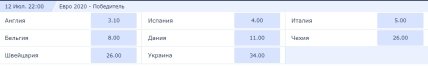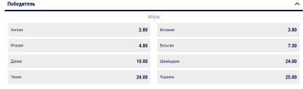 По мнению аналитиков, фаворитом чемпионата Европы является сборная Англии, которая в 1/8 финала переиграла немцев. Успех "Родоначальников футбола" оценивается коэффициентом 2,80-3,10 (35%). Следом в котировках специалистов идут испанцы, которые в сумасшедшем матче выбили хорватов - 3,80-4,10 (26%). Замыкают тройку фаворитов итальянцы, обыгравшие в 1/8 финала австрийцев - 4,80-5,00 (около 20%). Сборная Украины является главным аутсайдером стадии плей-офф. На успех команды Андрея Шевченко можно сделать ставку с коэффициентом 25-34, что примерно оценивается вероятностью в 3-4%.