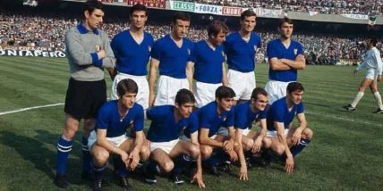 1968: Италия - Югославия (1:1, 2:0 в переигровке)В тех решающих матчах домашнего Евро итальянцы (на главном фото - Италия -1968) таки выгрызли победу. Сначала они добыли ничью в самой концовке игры с югославами благодаря голу "интериста" Анджело Домингини, а затем, спустя двое суток, обыграли "югов" 2:0 с мячами великих Луиджи Ривы и Пьеро Анастази.