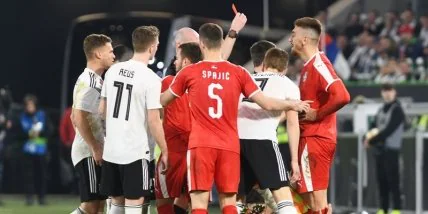 Именно полузащитник дортмундской Боруссии снабдил Горецку мяч в чужой штрафной, а тот убрал противника и восстановил паритет. Буквально сразу же немцы могли выйти вперед, но Сане, убрав двух противников, пробил точно во вратаря. Градус матч повысился уже в компенсированное время, когда Йовичич повздорил с Сане. Немцу не понравилось, что его придержали руками и он начал толкать противников. Буквально через пару минут Павков совершил мерзкий фол против Сане и был удален. Лерой, кажется, отделался лишь болевым шоком.