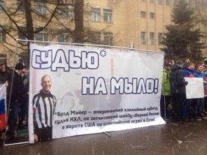 Российские хоккейные болельщики организовали пикет рядом со зданием посольства США в Москве. Организаторы акции протеста принесли баннер с надписью "Судью на мыло" и изображением арбитра НХЛ Бреда Майера , не засчитавшего шайбу сборной России в ворота США в матче группового раунда Олимпиады в Сочи.