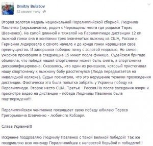 "Вторая золотая медаль национальной Паралимпийской сборной. Людмила Павленко (харьковчанка, родом с Черкащины места где родился Тарас Шевченко). На самой длинной и тяжелой на Паралимпиаде дистанции 12 км лыжной гонки она в компании трех знаменитых лыжниц из США, России и Германии лидировала с самого начала и до конца гонки наращивая своё преимущество. И завершила победно гонку с золотой медалью. Но самое ужасное произошло в следующие 15 минут после финиша. Судейская бригада объявила, что победа нашей спортсменки может быть снята, а спортсменка дисквалифицирована. Оказалось, что один из ремешков, который пристегивал нашу спортсменку к лыжному бобу расстегнулся (Люда передвигается на инвалидной коляске). Судьи посчитали, что это нарушение техники прохождения дистанции. Фактически это была попытка забрать у Украины победу на Паралимпиаде. Второе место США. Третье - Россия.Но после заседания жюри и просмотре видео на дистанции - победа Людмилы Павленко была подтверждена!!!