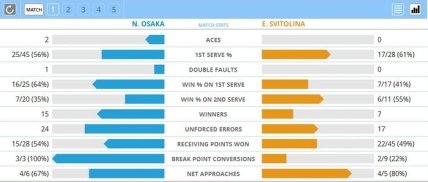 В первом раунде Свитолина никаких проблем с Викторией Дюваль не испытала. Вероятность, что таковые ей доставит Наоми Осака, была также невысокой. Самым примечательным в японке была ее внешность (согласитесь, не каждый день встретишь темнокожую азиатку), но вот в остальном 18-летняя теннисистка была типичным представителем подрастающего поколения со знакомым набором атрибутов: физическая мощь, плотный удар с обеих рук и… пожалуй, все. Единственное, чего нельзя в таких случаях упускать опытным игрокам — это фактора задора, который всегда присущ молодежи, хотя эта их страсть зачастую ведет к нестабильности и, следовательно, неудачам.